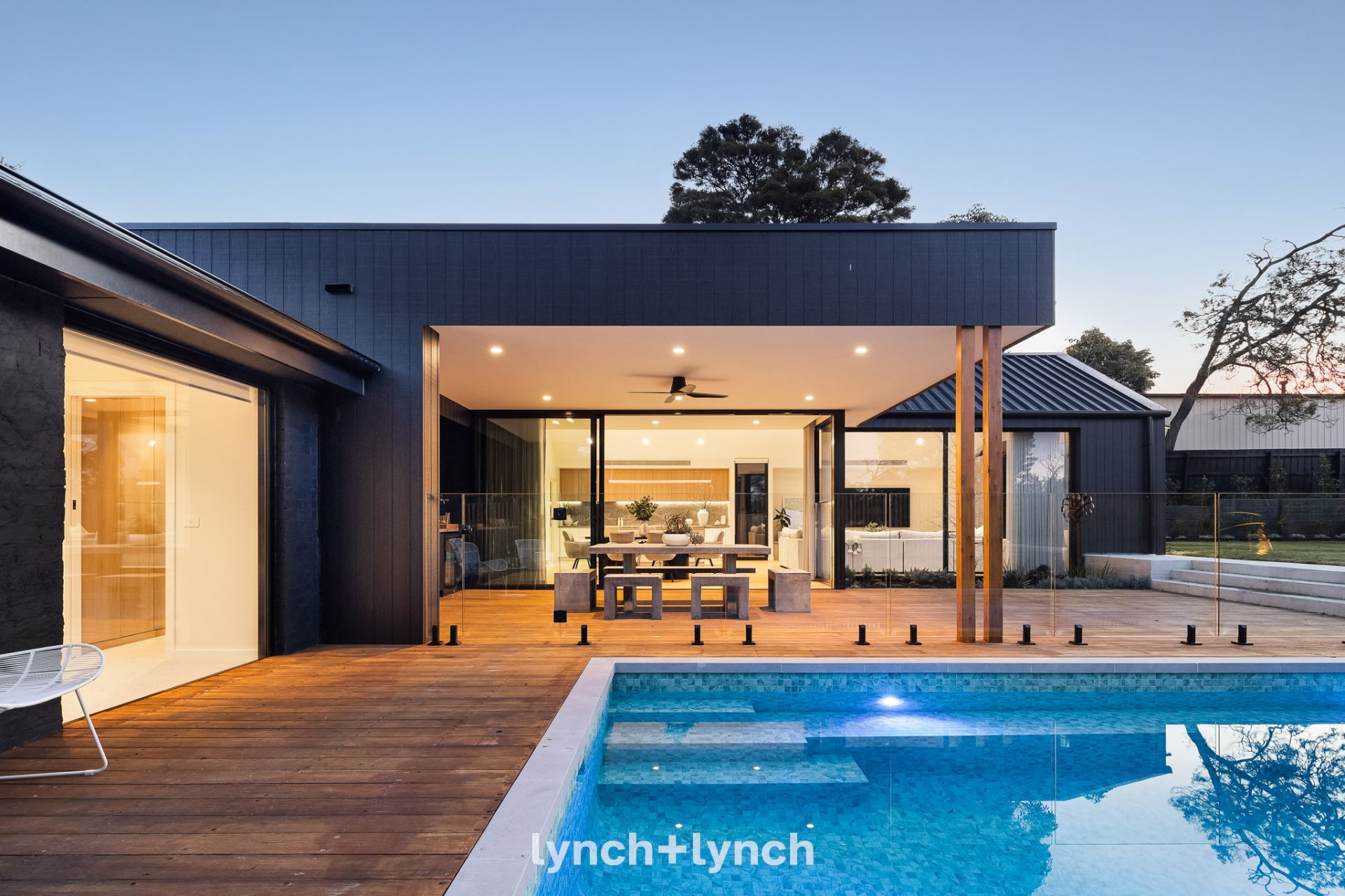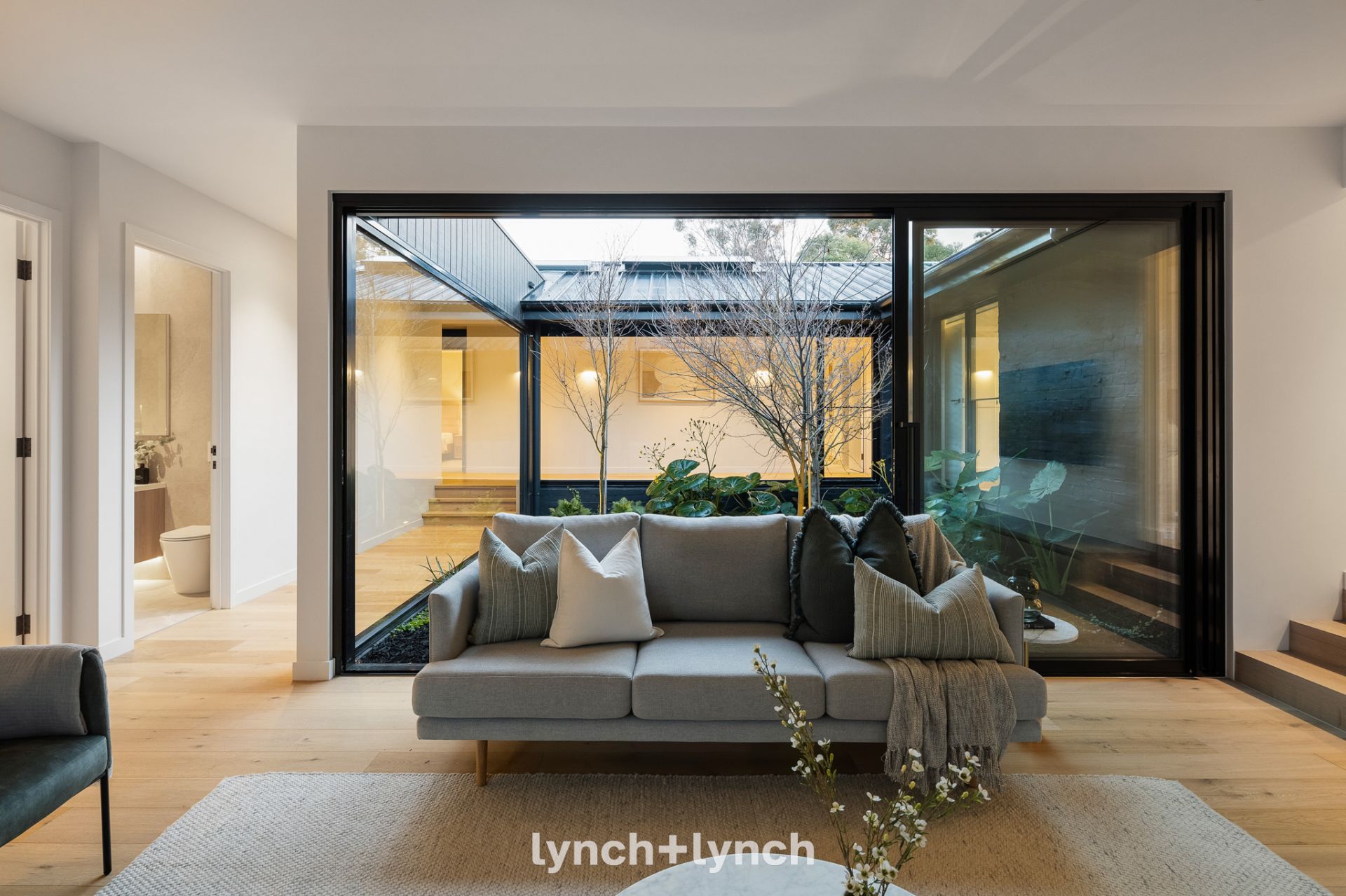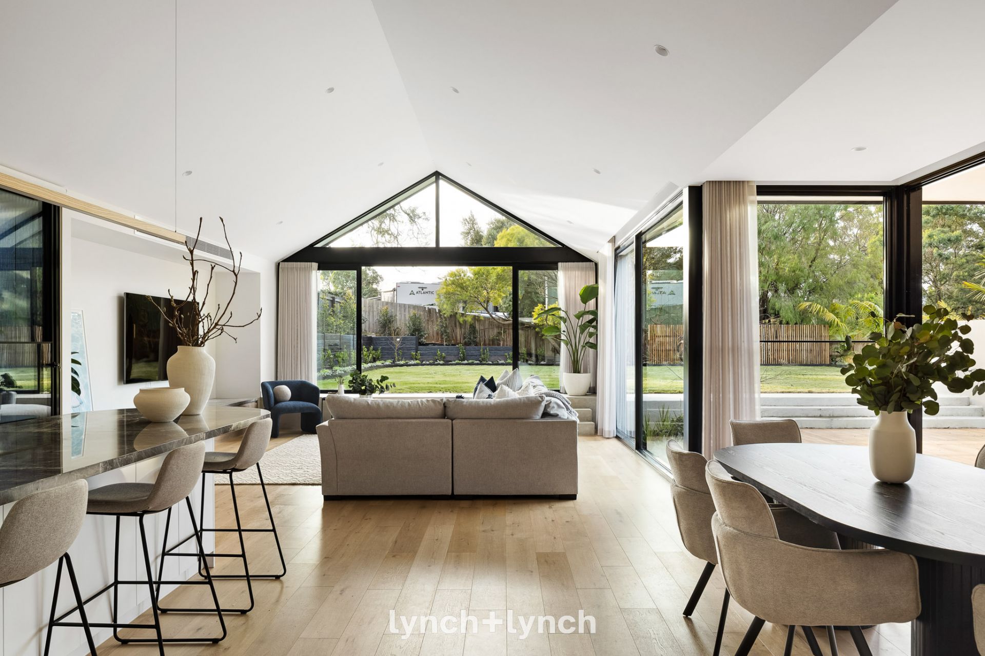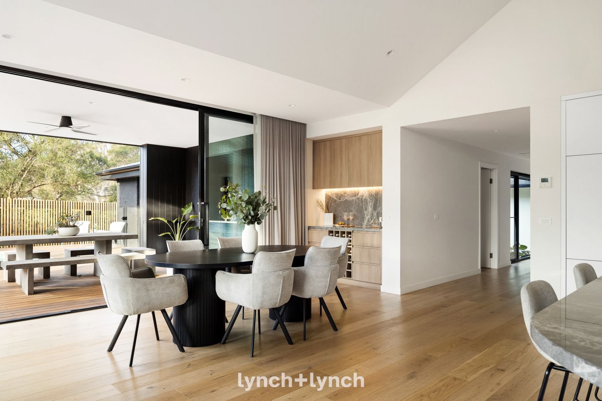 Vaulted ceilings and an impressive central internal garden courtyard anchor the open layout, where living and dining seamlessly connect to the alfresco deck and a feature swimming pool, which leads to an expansive lawn. The kitchen flows effortlessly into the main living domain, framed by expansive glazing and stunning garden vistas.