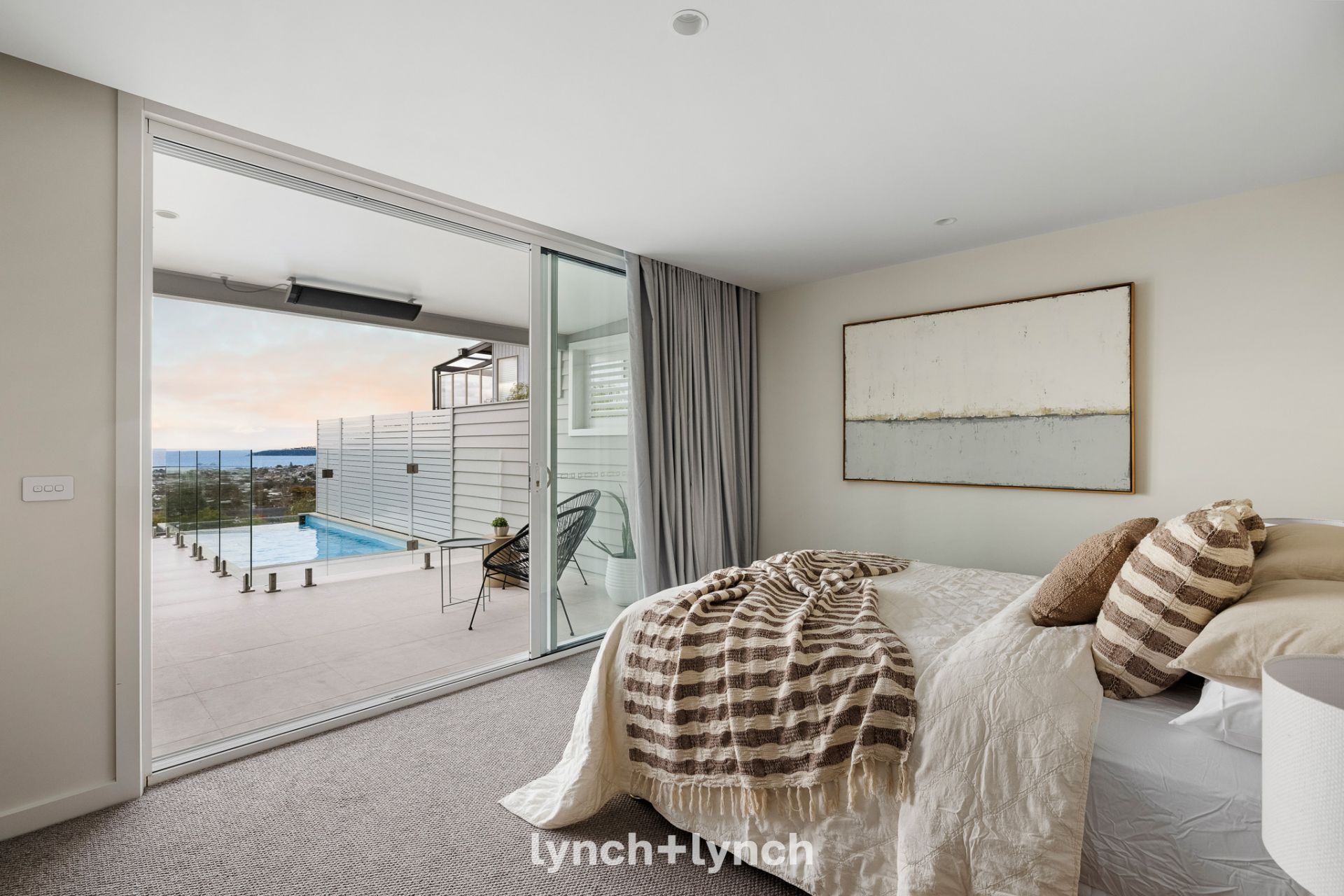 The main suite, with outstanding bay views, is a private retreat with direct access to the pool, a walk-in robe, and a beautifully appointed ensuite. Two additional bedrooms with built-in robes are served by a central bathroom. On the lower level, a spacious retreat is complemented by a two-car garage with EV charging, a workshop, and dedicated storage.