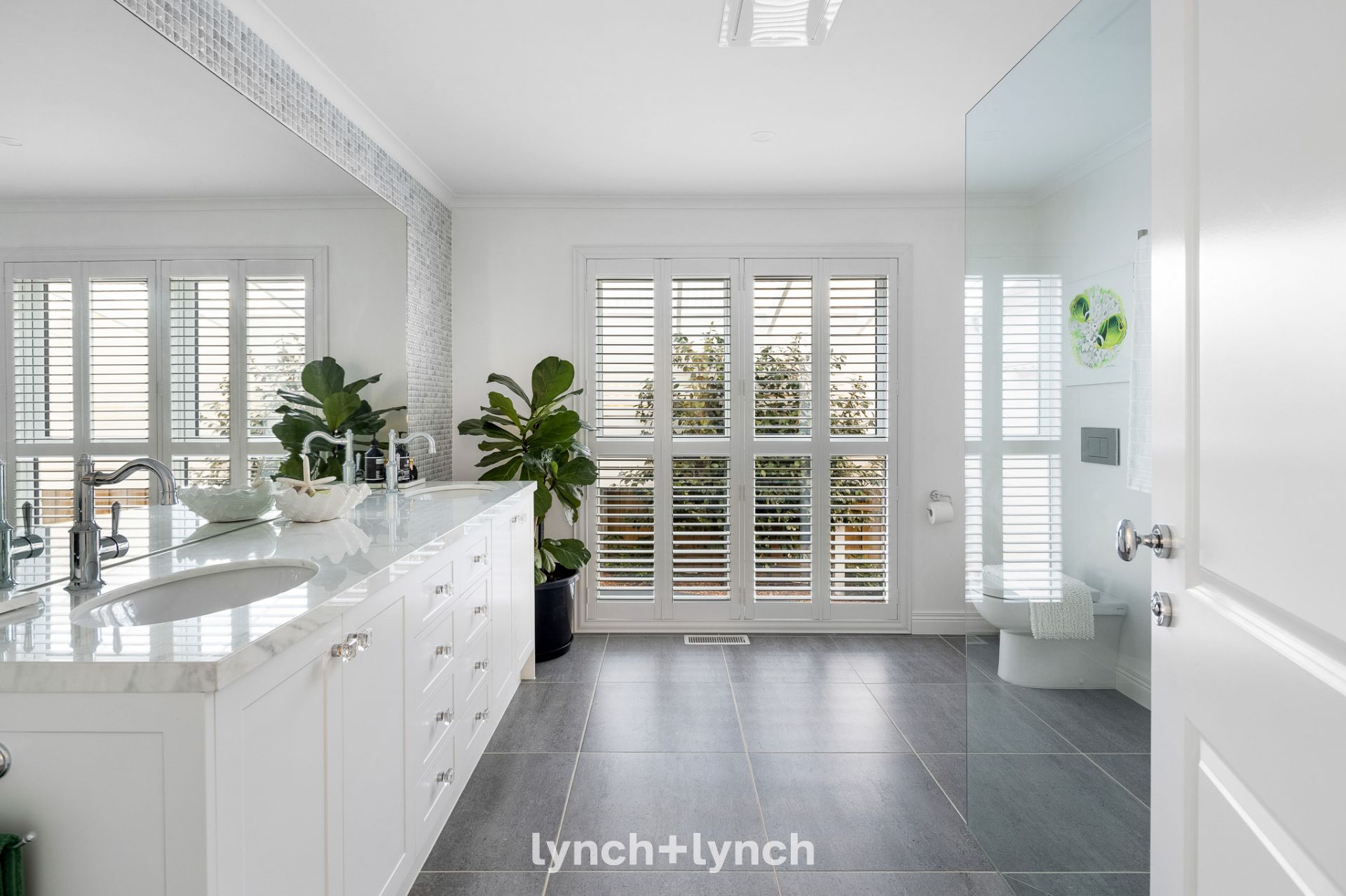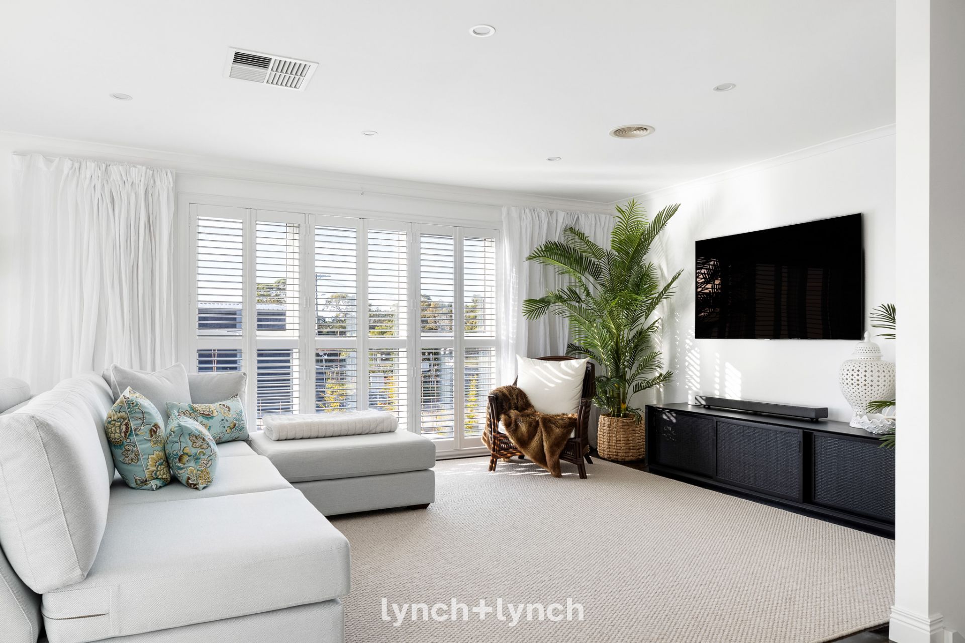 The ground floor reveals a refined kitchen with custom joinery, adjoining dining and living spaces that connect seamlessly to an expansive entertainer's deck and covered alfresco. A luxurious central bathroom serves additional bedrooms, complemented by a flexible retreat ideal as a fourth bedroom.